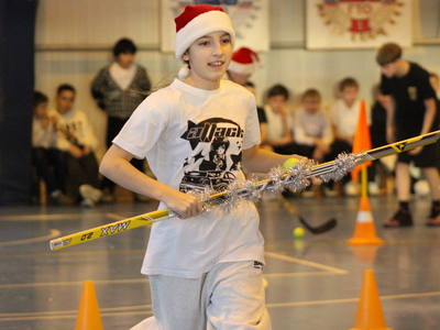 «Новогодний хоккей»: Самый ароматный этап! Вместо шайбы — мандарин, а вместо льда — спортивный зал. Нужно было провести цитрус клюшкой «змейкой» между конусов, не потеряв драгоценный «снаряд».