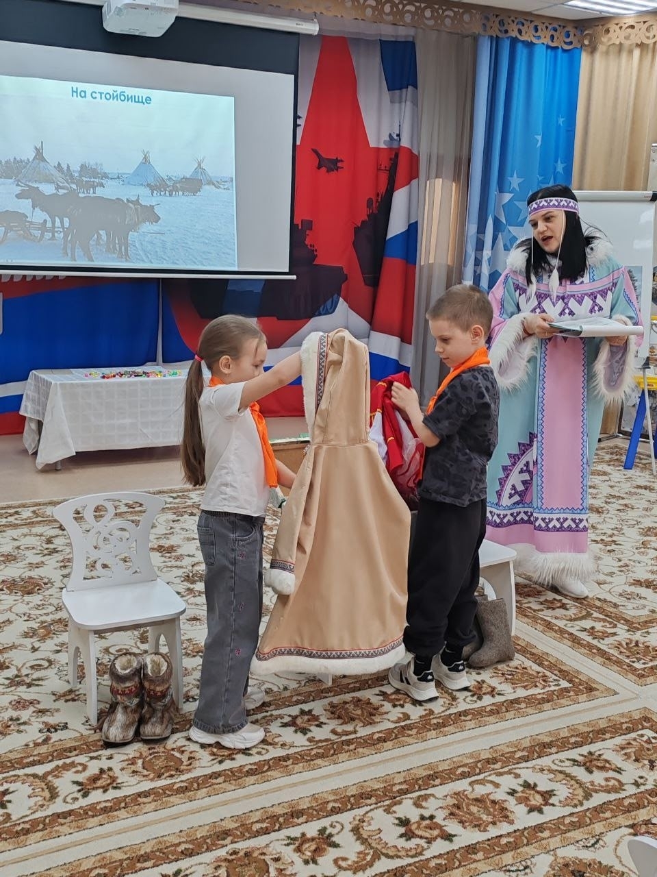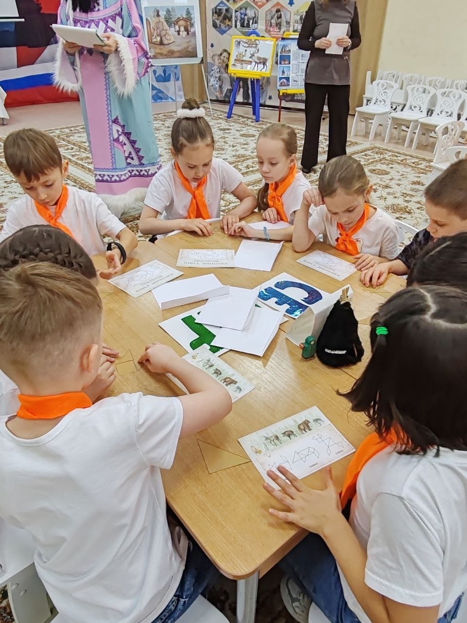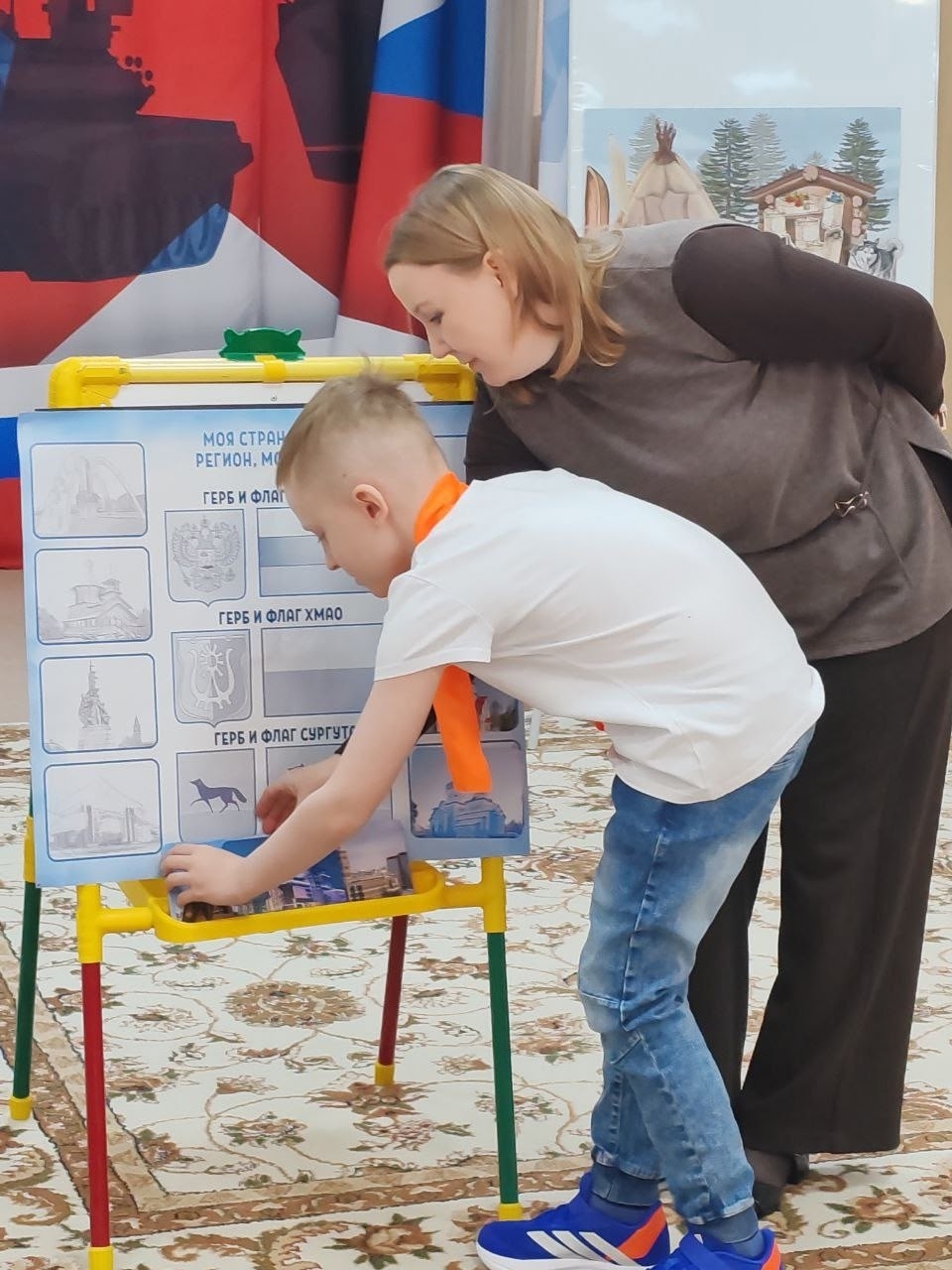 Игра состояла из множества интересных этапов, каждый из которых позволял детям проявить свои знания и умения. Участники соревновались в распознавании герба и флага Югры, отгадывали тематические загадки, собирали пазлы с изображениями животных нашего региона, выбирали национальную одежду народа ханты и даже дегустировали блюда традиционной кухни.